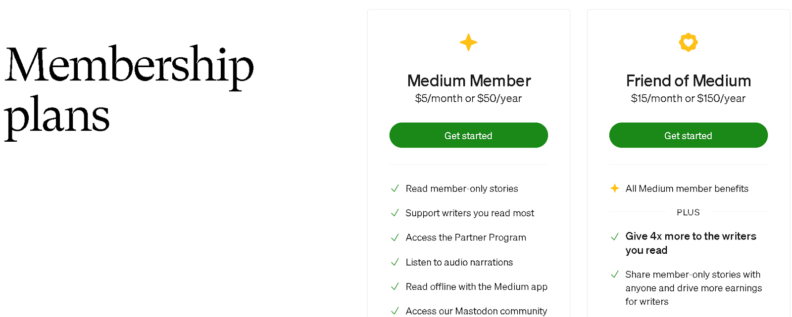 Pricing: You can post content for free. To earn money on this blogging platform, you need to subscribe to any of its membership plans: