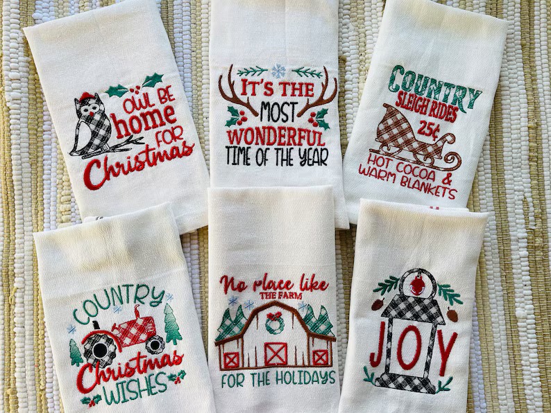 What it is: Light kitchen towels stitched with botanical outlines, humor, or seasonal themes