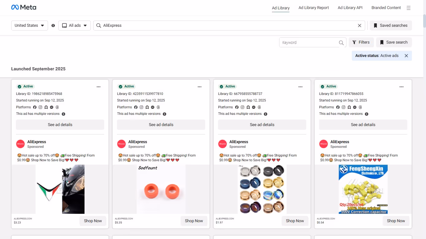 That makes them a goldmine for competitive intelligence. Tools like Meta Ad Library show you when competitors launch campaigns and what kind of ads they’re running. In this case, it shows AliExpress ads in action on different platforms.