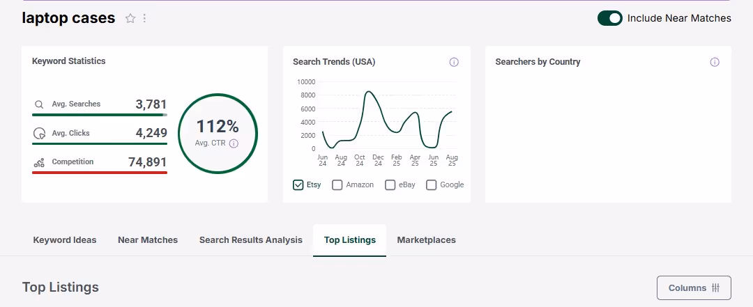 Coming up with random designs is a gamble. Tools like eRank and EtsyHunt show you what shoppers are actually searching for on Etsy. For instance, a simple ‘laptop cases’ keyword search on eRank reveals in-depth results on keyword ideas, search volumes, top listings, and more.