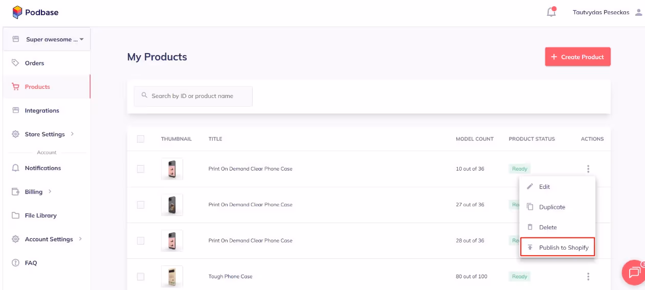 First, connect your Shopify, Etsy, or WooCommerce store to Podbase. Then, in your dashboard, select the product you want to publish.
