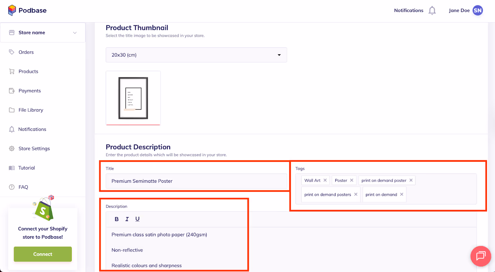 Pick the product you want to sell using a print-on-demand company. Then, upload your design onto it. Next, you can customize product title, descriptions, tags, and pricing as shown below: