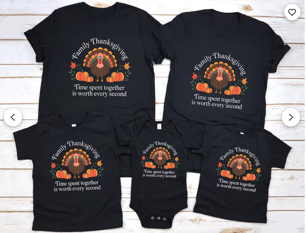 Take this matching family Thanksgiving t-shirt set, for example. The t-shirts are festive designs that family members can wear together during holiday gatherings.