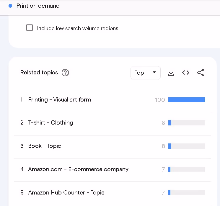 You can use tools like Google Trends to check niches with steady demand. For instance, you can check what people are searching for under the print-on-demand category.