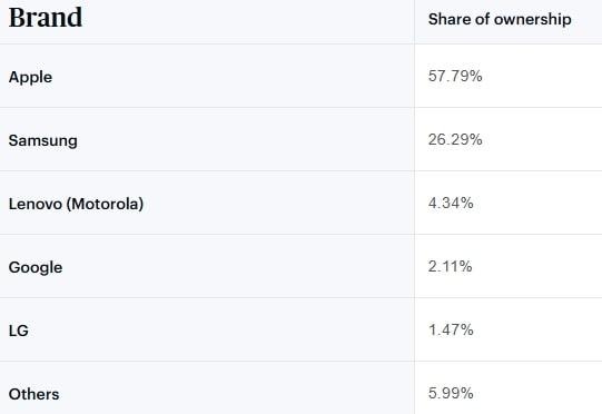 Apple is the leading smartphone brand in the US, with a 57.79% market share. Samsung follows closely, with a 26.29% market share.