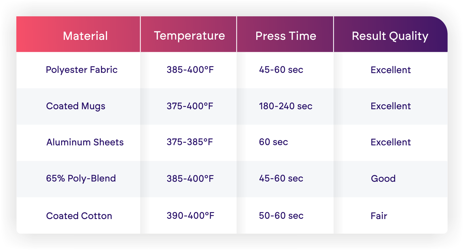 Set your heat press to 375-400°F. Press for 30-60 seconds with even pressure. Always check your blank’s instructions for the best settings.