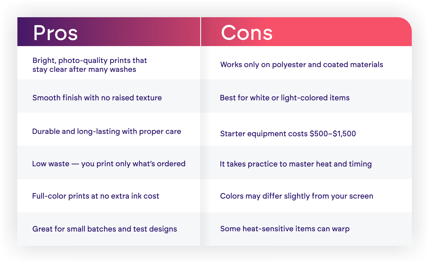 The biggest benefit of sublimation printing is its quality. Designs stay sharp after hundreds of washes, and customers appreciate the smooth, soft finish. But the biggest drawback is material limits. You can’t print on pure cotton, which narrows your options.