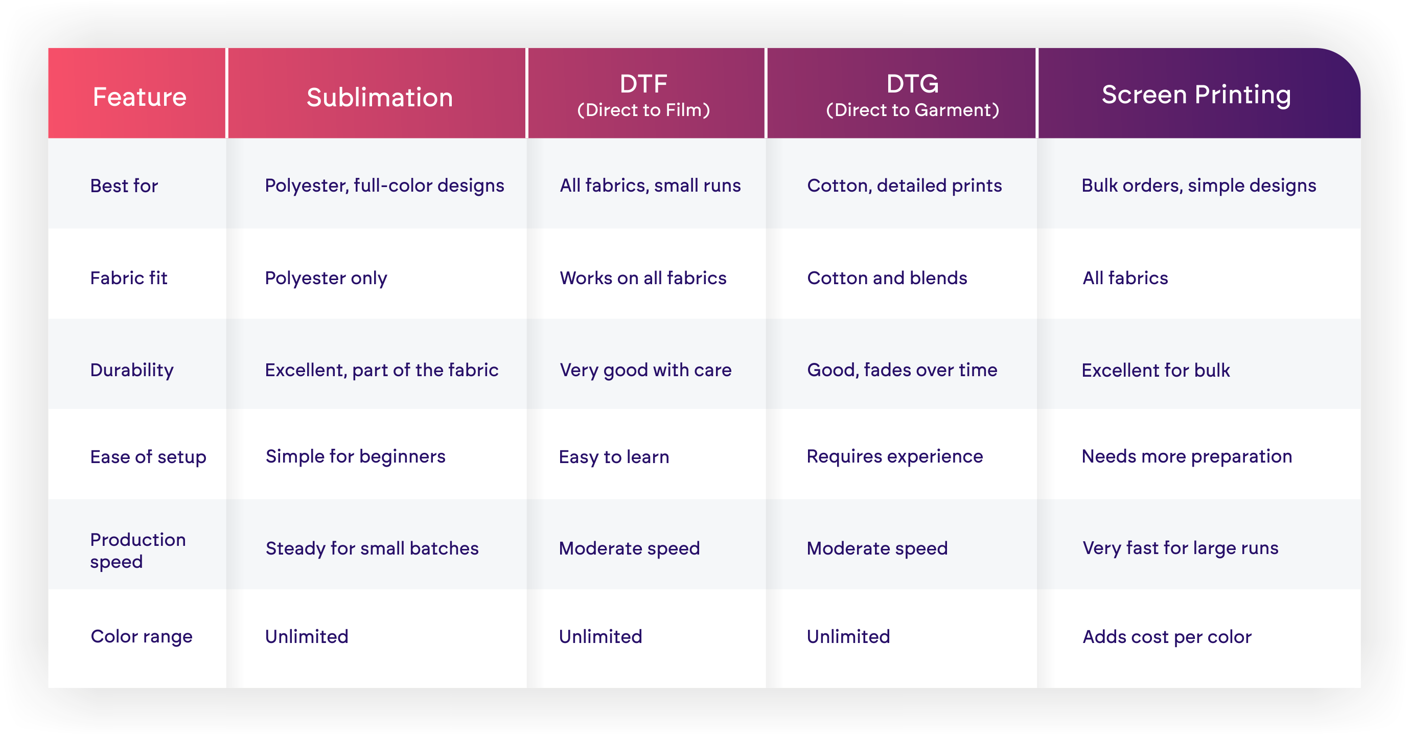 Your printing method affects your costs, quality, and product range. Each one suits different goals. Let’s look at how sublimation printing compares with other popular printing methods.