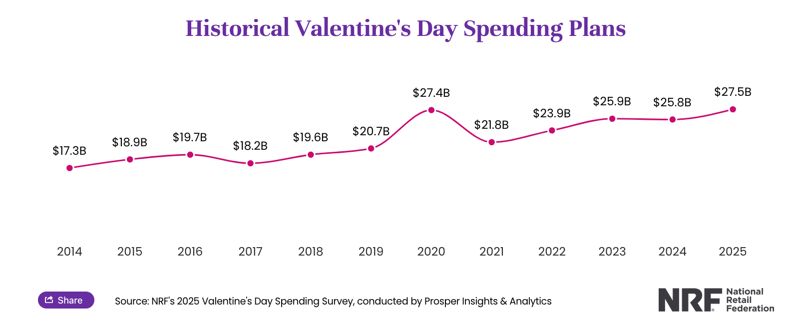 According to the National Retail Federation (NRF), total Valentine’s Day spending statistics reached a record of $27.5 billion in 2025. This beat previous highs set in 2020 and 2024.