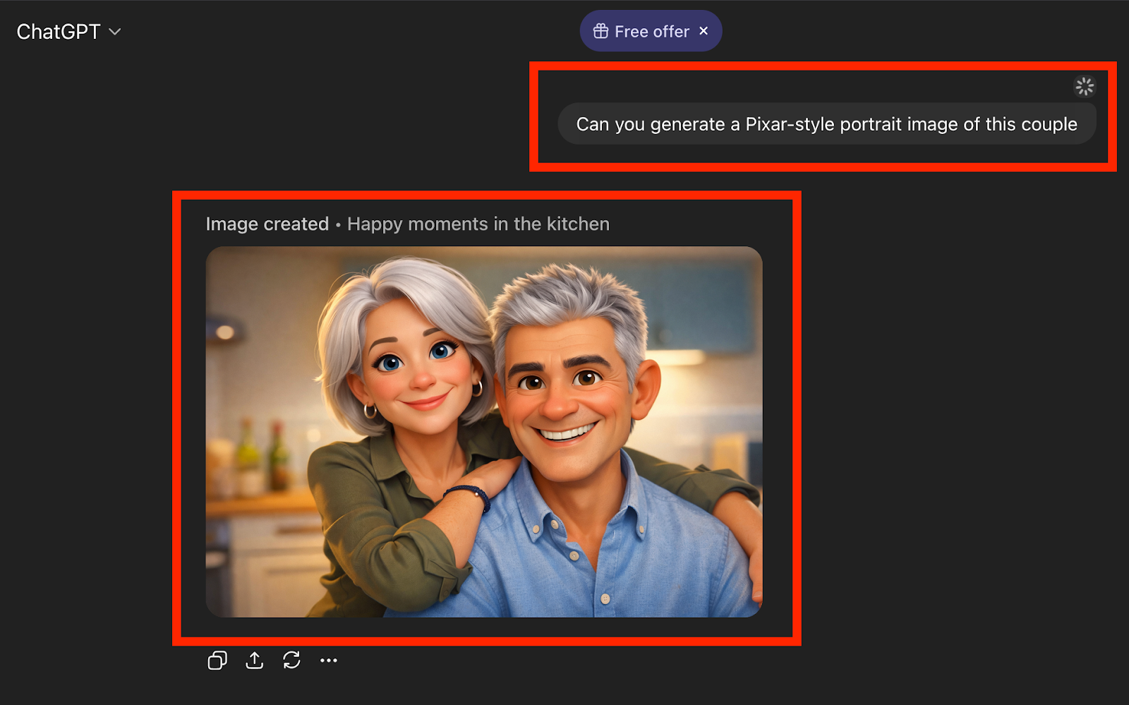 The screenshot below shows the result of an AI-generated image “Pixar-style” portrait created from a real photo: