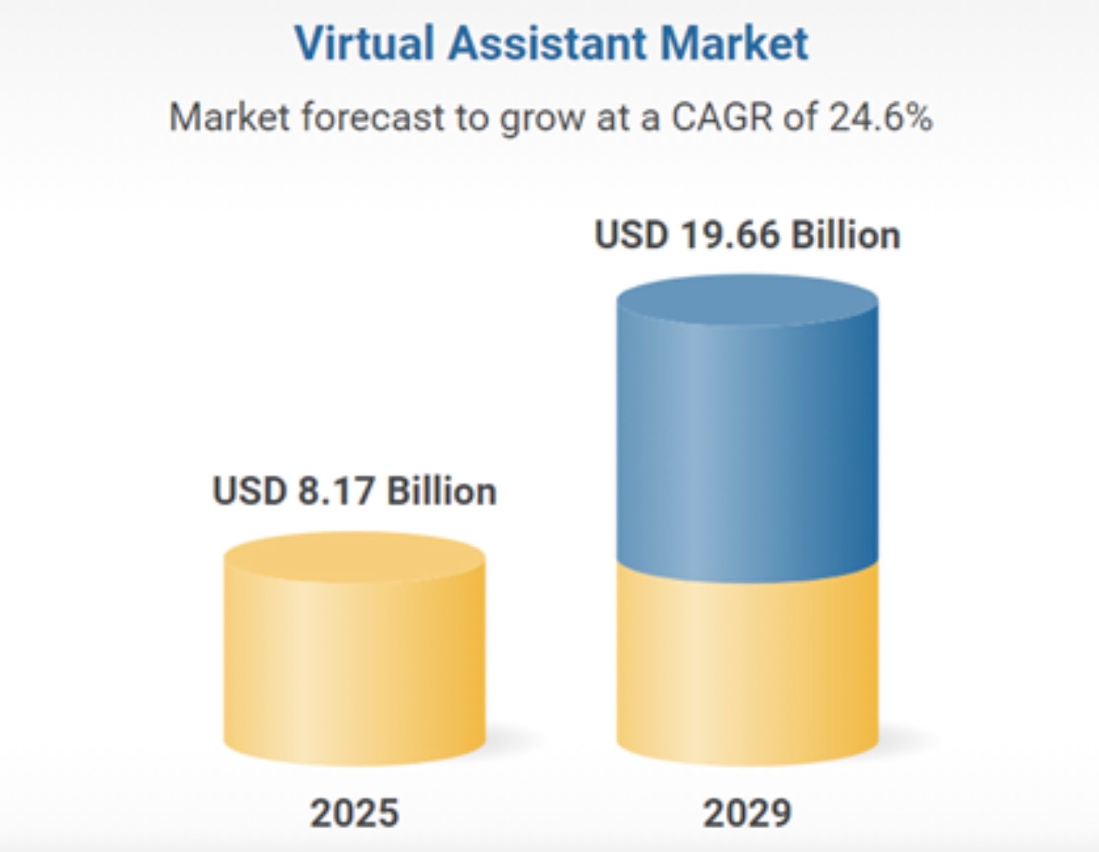 The virtual assistant market grew from about $6.37 billion in 2024 to $8.17 billion in 2025. It’s expected to reach $19.66 billion by 2029.
